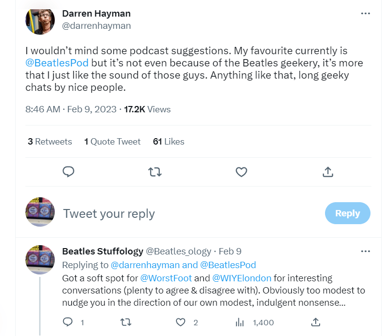 But here’s the thing, it’s highly likely that the things that I enjoyed, bored others. And this reminded me that I had engaged with a Twitter user over the weekend about podcasts they may enjoy. I recommended Worst Foot Forward and the hosts (and also a collaborator on their worst Beatles song episode got involved). The original poster suggested his three worst Beatles songs which included one slightly controversial choice in the fandom and one extremely controversial choice. After I replied reasonably diplomatically, one of the hosts of Worst Foot Forward also engaged with the well meaning discussion.
